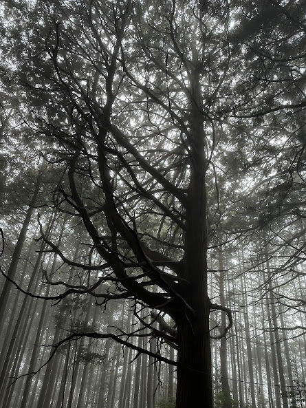 軍畑駅では小雨模様のなか、女性だけの団体ツアーを横目に身支度を整え、2 班に分かれて出発です。最初の30分は高源寺を過ぎる辺りまで車道歩き、登山道に入ってからもひたすら長い急登を皆黙々と登って行きます。常福院で雨を避けながら早めのランチ、眺望のない高水山から岩茸石山へと歩を進めます。岩茸石山山頂からの素晴らしい眺めは雨のため断念。風が無いせいか高度を上げてもさほど寒くなく、心配していた雪にもならず。途中ですれ違ったのは写真を撮ってもらったトレラングループ含め数組。雨と霧のカーテンの中、厳かで幻想的な雰囲気の山行を楽しむことが出来ました。さすがに紅葉は終了、山道に堆積した落ち葉が適度に水分を含み滑りやすくなっていて、所々気を使いましたが、急坂や岩場もあったりしてバリエーションに富み、楽しいトレッキングコースでした。低山だけに夏だったら大変かもしれません。三座目の惣岳山につく頃には予報通り雨もやみ、少し晴れ間が見える中、コースタイム通り御嶽駅に無事下山となりました。三山全てで集合写真を撮りミッションも終了、ほぼ雨中の山行となりましたが、たまにはこういう自然を感じる山行もいいかなと思います。