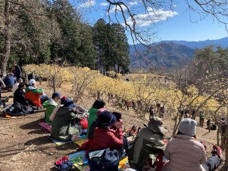 宝登山の山頂は広くて、ものすごい人出。100人以上はいると思う。あちこちに座り、雰囲気を楽しんでいる。南側の斜面は段々になっており、何千というロウバイ(蠟梅)が今が盛りと咲き誇っている。はるか向こうには、武甲山も見えている。いい時期に来たと思う。この山行を企画してくれたサンスケさんに感謝!感謝!