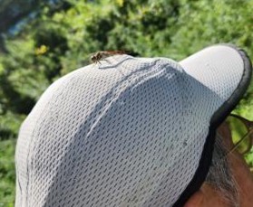 社山の山頂に着くと、真正面に堂々とそびえる男体山!青空を背景にした姿は息をのむほど美しく、皆で歓声を上げました。そこへ赤とんぼがふわりと舞い降りてきて、頭や肩に止まってくれる場面も。